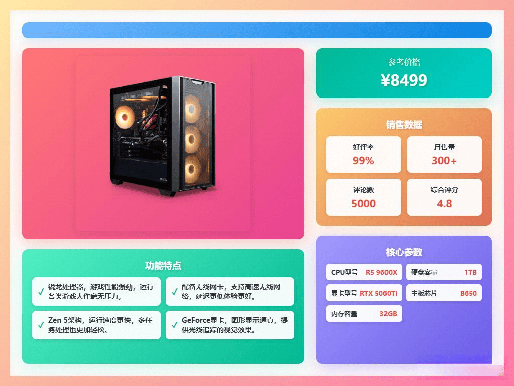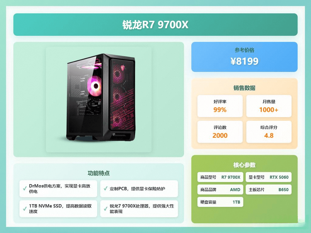 这款组装电脑搭载了AMD锐龙R7 9700X处理器,8核16线程,性能强劲,最高超频可达5.4GHz,游戏表现非常出色。搭配RTX 5060显卡,光追效果极佳,游戏画面真实感十足。