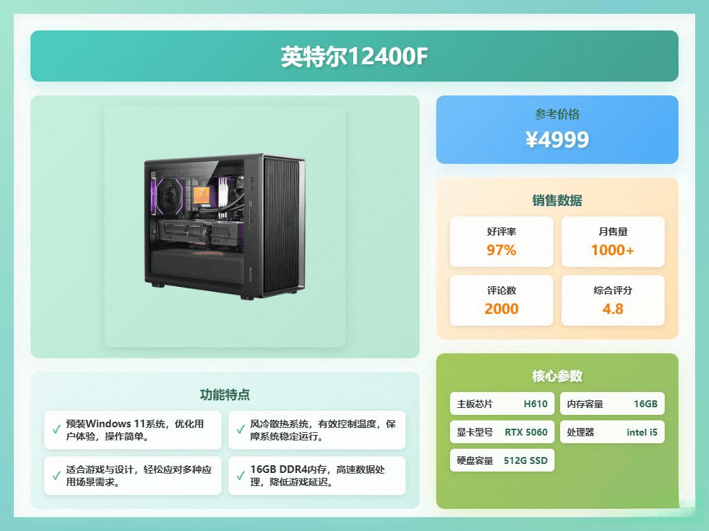 这款电脑搭载的i5-12400F处理器性能出色,六核十二线GHz,日常应用和主流游戏完全足够。显卡方面,RTX 5060 8GB D7的配置让游戏画面流畅,效果出色,配合DLSS 4技术,帧率更高,画面更细腻。