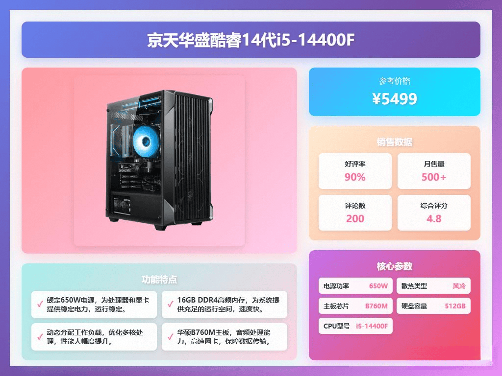 京天华盛的这款主机搭载酷睿i5-14400F处理器,拥有10核16线GHz,游戏和多任务处理都非常流畅。华硕B760M主板则为音效和网速提供了保障。