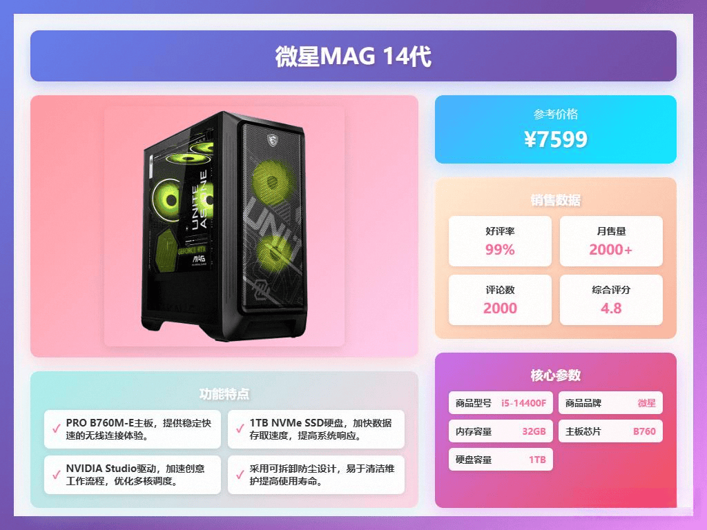 京天的这款组装机搭载i5-14600KF处理器,性能非常强劲,适合多核任务处理。B760芯片组主板提供了稳定的运行环境,配合高速千兆网卡,网络体验也非常好。