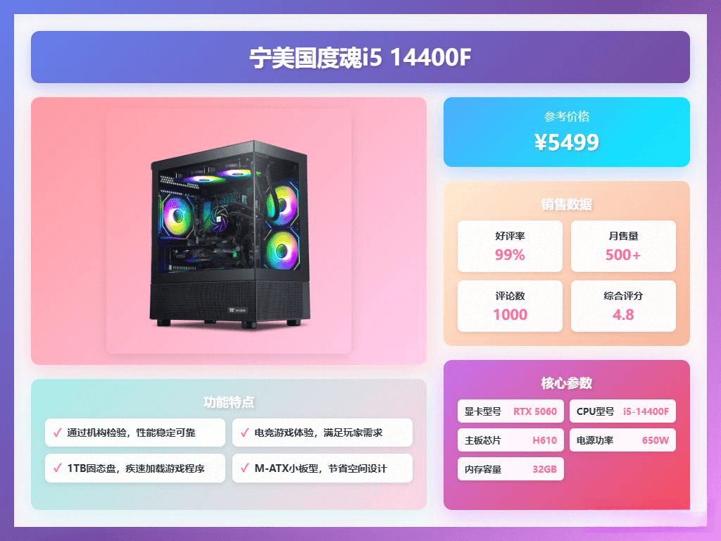 存储方面,1TB PCIe 4.0 SSD的配置让你告别卡顿,32GB DDR5双通道内存则确保了多任务处理的流畅性。主板采用华硕PRIME B650M-F,散热和供电设计都非常可靠。此外,机箱支持AURA SYNC神光同步,炫酷的灯效让你的游戏空间更加个性化。