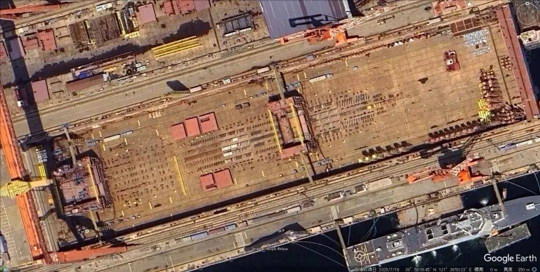 北方某造船厂的船坞里,最近出现了个“大家伙”。谷歌地球更新卫星照片后,军迷们都激动坏了。照片里,两个宽度超过 42 米的巨型分段静静地躺在船坞里,样子跟航母的水下舰体特别像。这会不会就是传闻中的 004 型核航母呢?有没有成为“全球最大”航母的可能?咱们从三个重要信息来分析一下。